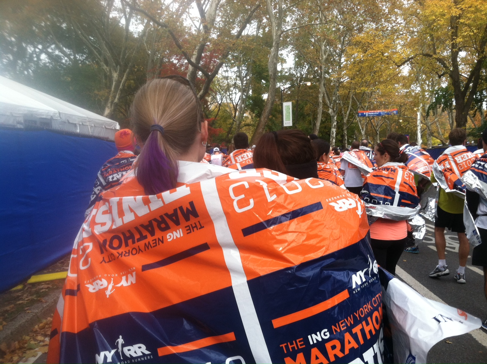 I walked a few steps, remembered to stop my Garmin, and looked at the screen for the first time in 9 miles. It said 3:35:11. I turned to Tanya and said, “My watch has been all over the place, but it’s possible I didn’t break 3:35.” She pulled out her phone to check my finishing time on the NYCM App… sure enough, 3:35:07. I threw my arm over her shoulder and said, “Honestly, I didn’t have another 7 seconds in me–If that’s my time, I’m totally happy with it.” And then she pretty much carried me for a mile of walking, which is impressive if you know how petite Tanya is.